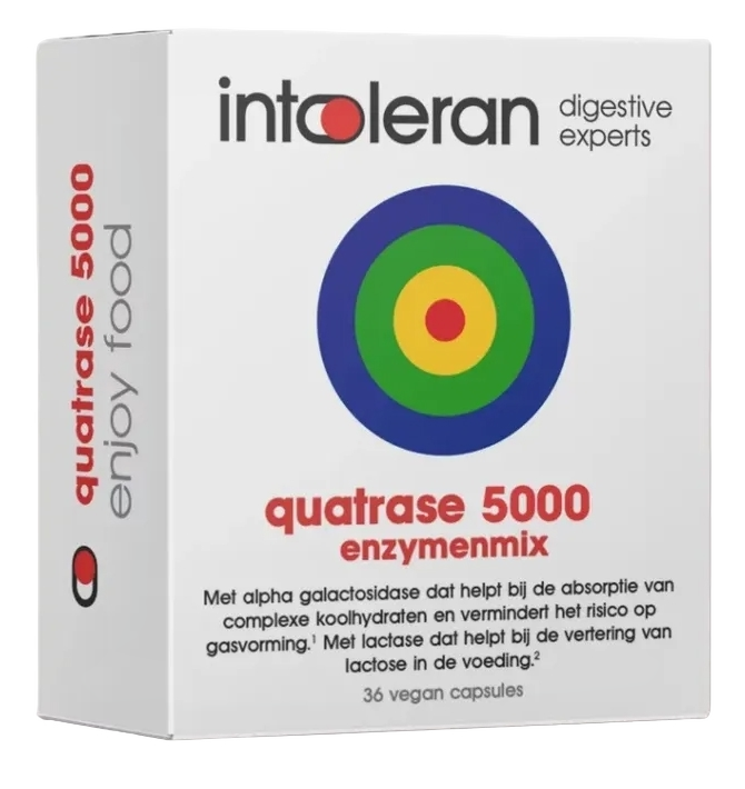 Intoleran Quatrase 5000 Enzymenmix Capsules (36 stuks) bevat een speciaal samengestelde mix van de spijsverteringsenzymen alpha-galactosidase (600 u), xylose-isomerase (5000u), invertase (250 u) en lactase (5000 FCC). Alpha-galactosidase helpt bij de vertering van complexe..EAN: 8718692032873